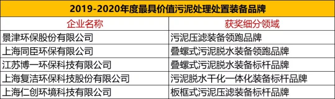 以下为“2019-2020年度最具价值污泥处理处置装备品牌”详细名单: