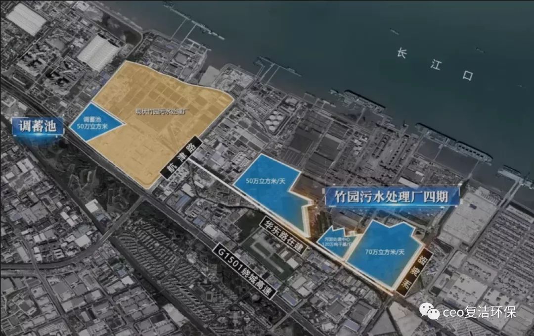 竹园污水处理厂四期工程是上海市重大工程项目,同时也是“苏州河环境综合整治四期工程”的重要组成部分,是践行长江大保护战略、落实中央环保督察整改要求的重要举措之一。该项目占地面积58.7公顷,建设内容为新建120万立方米/日污水处理厂,新建120吨干基/日污泥处理设施,新建进出厂总管5.1公里,同时片区内新建50万立方米调蓄池,其中污水处理采用运行成熟、稳定可靠的AAO生物处理工艺,污泥处理采用“脱水干化+电厂掺烧”的处理工艺,出水水质执行国家一级A标准。