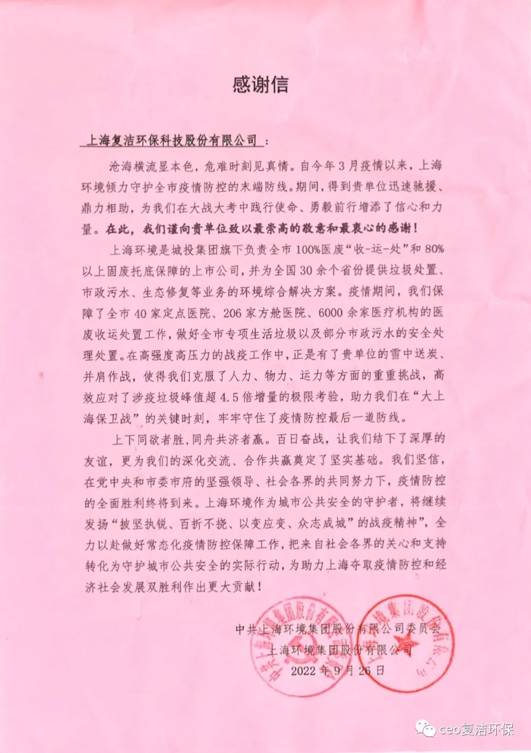 青浦区污泥干化焚烧工程由上海环境集团股份有限公司作为建设单位,该项目被列为青浦区、上海市两级重大项目,自今年3月疫情以来,上海环境集团倾力守护全市疫情防控的末端防线。无论是常态化疫情防控的流通受限阶段,还是在疫情严峻的封控期间的人、物流通困难阶段,复洁环保始终以最大程度的努力,时刻服务好现场需求。常态化疫情防控时,在政策允许前提下,利用成熟的售后机制,调动一切资源,第一时间响应客户需求;疫情封控期间采用电话、视频连线等进行远程指导,为现场提供技术支持和服务,确保了厂区设备系统安全稳定,得到了上海环境集团的高度肯定。日前,上海环境集团为对我公司的迅速驰援、鼎力相助表示感谢,特向我公司发来了感谢信并送上锦旗。