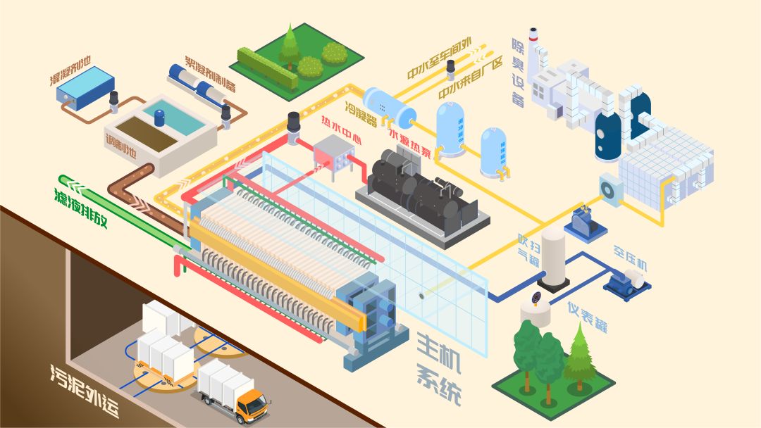该技术装备利用环境压强减小水沸点降低的原理,创造性地将机械压滤脱水与真空干化技术合为一体,实现高效脱水、低温干化和工艺节能。在此基础上,采用进料过滤、隔膜压滤、真空脱水和干化过程的机、电、液一体化设计与制造模式,复洁环保自主研发了系统化、自动化、智能化的污泥脱水干化一体化技术装备,可将污泥含水率由90-99%一次性降至30%以下(并可在含水率10-60%之间灵活调整),最大限度地实现了污泥减量化,攻克了污泥等物料脱水干化一体化技术难题,并大幅降低传统常压条件下污泥热干化的热源温度(100℃以上降至90℃以下)、汽化温度(100℃降至45℃左右)以及脱水干化全程的能耗(节能15%以上),填补了国内外污泥脱水干化一体化处理技术的空白。该技术装备主要针对污泥等难处理的物料以及要求滤饼含水率低的物料进行固液分离,可广泛应用于市政与工业污泥的脱水干化、以及石油化工、煤炭、食品、制药、有色、轻工等行业固废或特种物料的固液分离。