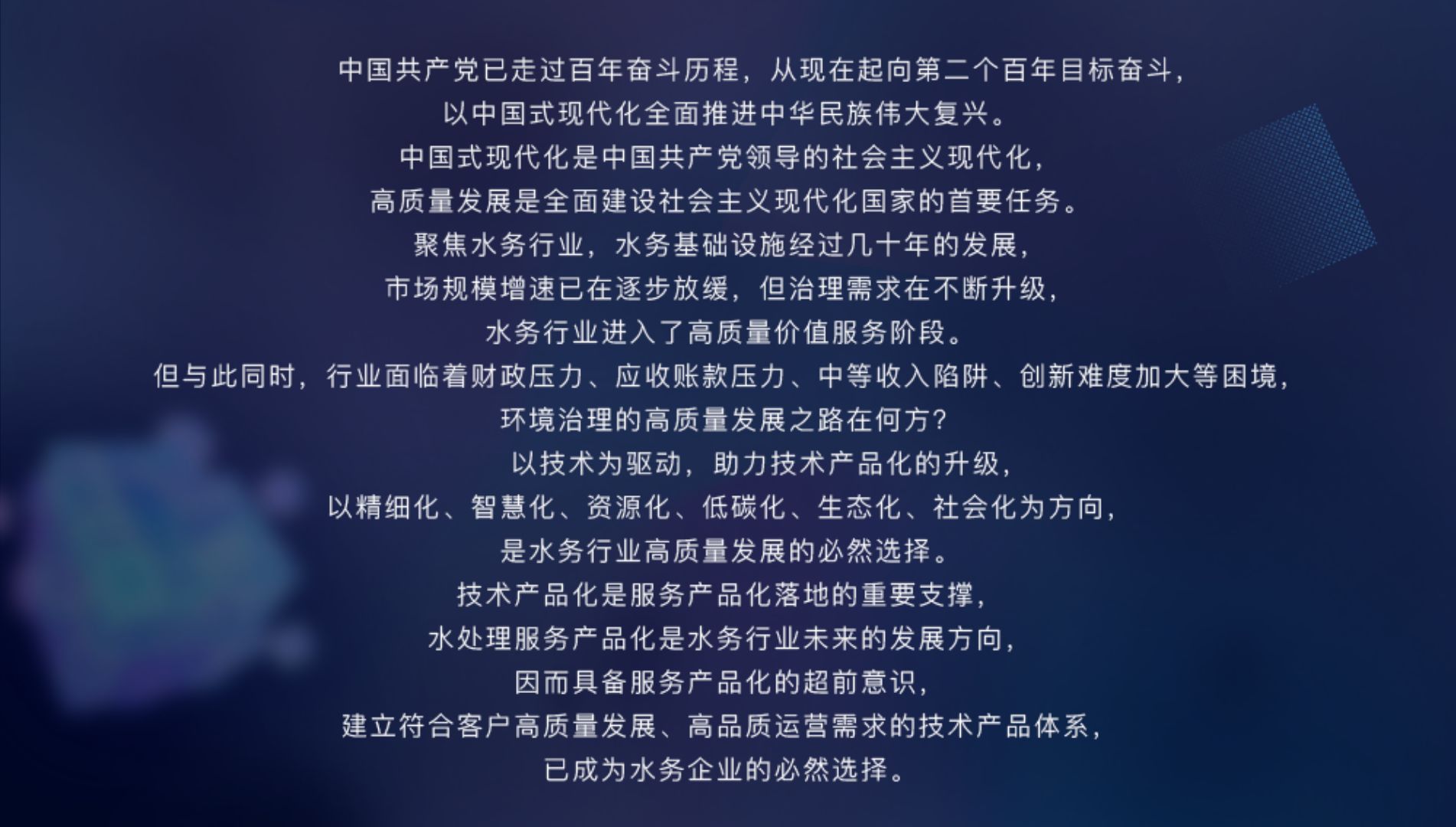 以技术为驱动,助力技术产品化的升级,以精细化、智慧化、资源化、低碳化、生态化、社会化为方向,是水务行业高质量发展的必然选择。