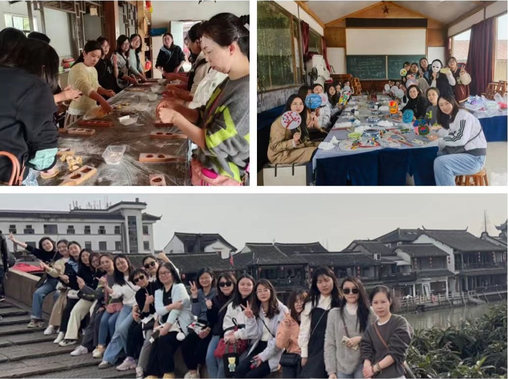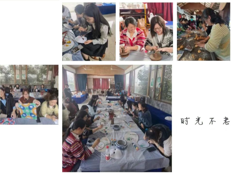 第一站,我们来到了四季百果园,在远离都市的喧嚣观赏田园美景的同时,不仅了解了传统手工作坊的历史文化,还体验了画脸谱、沾染、制陶和做米糕等传统手工艺。聪慧的复洁女神们通过短暂地学习,很快掌握了各项手工艺的制作技巧,一支支画笔行云流水般穿梭于脸谱之上,一幅幅淡雅清新的图案跃然于团扇之中,不一会功夫,别具一格的脸谱和美伦美奂的团扇就完成了。制陶算是一项颇具难度地挑战了,让平日里习惯于伏案敲击键盘的女神们有些犯难。随着老师耐心地指导和大家不断地尝试,女神们逐渐GET到了制作的要点,各种造型独特的杯盏也纷纷呈现。
