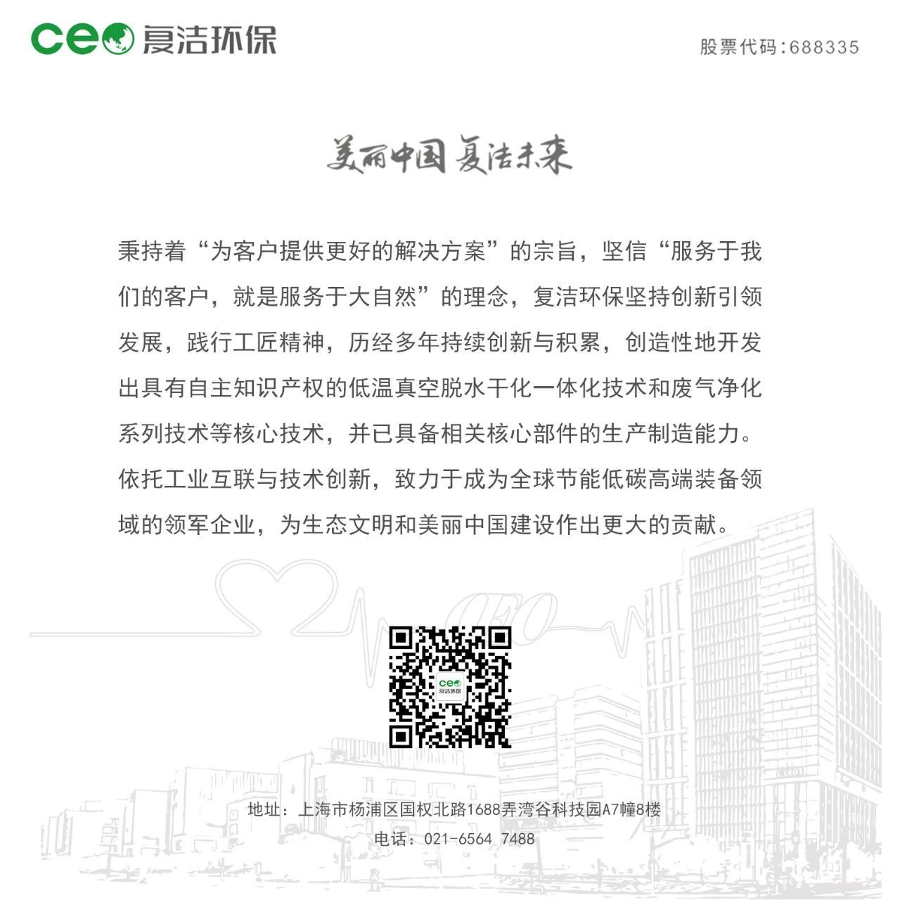 面向未来,复洁环保将继续深入贯彻高质量创新发展理念,积极实施减污降碳协同增效,持续探索绿色、节能高端装备领域的新技术与新需求,汇聚新兴力量,努力向成为全球节能低碳高端装备领域的领军企业迈进!