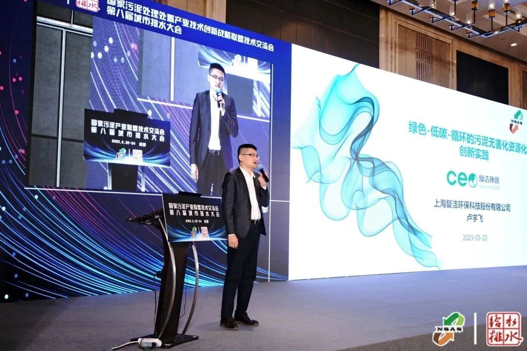 复洁环保副总裁兼研发中心主任卢宇飞博士在大会上以“绿色-低碳-循环的污泥无害化资源化创新实践”为题进行了主题分享,全面介绍了复洁环保在绿色低碳循环背景下,围绕污泥无害化资源化总体目标,在污泥脱水干化一体化、臭气精准高效净化、高温水源热泵节能降碳等领域的创新突破与特色亮点,展示了公司核心技术装备的最新实践应用进展,并展望了公司未来在节能降耗、能源资源回收、减污降碳方面的规划与愿景,得到了与会领导专家及行业同仁的积极肯定。