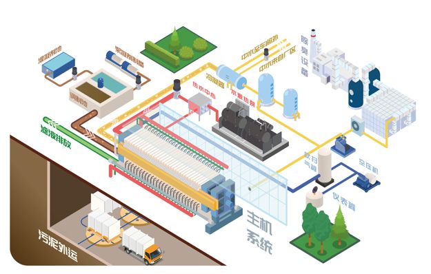 面向国家"双碳"战略目标要求,为真正实现以高效、低碳、经济方式处理污泥,公司创新应用高温水源热泵技术,从污水处理厂净化后的常温中水中提取热量,直接产生85°C左右的热水,为污泥脱水干化一体化设备提供所需的低品位热源,实现了污水的资源化、能源化,进一步降低了污泥脱水干化的单位运行成本与能耗,相比传统的脱水+干化"两段式"工艺,可实现能耗及单位运行成本降低30%左右,同时可显著减少碳排放。