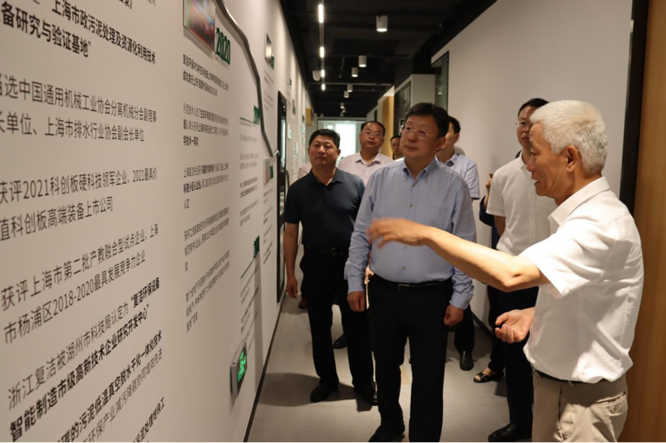 在黄文俊董事长的陪同下,董海明一行参观了复洁环保核心技术装备、智慧运维系统展厅,听取了公司在节能低碳高端装备领域的先进技术开发与生产制造能力介绍,了解了公司产能扩建与研发中心等募投项目建设进展、以及公司开展产学研合作与成果转化等相关情况。