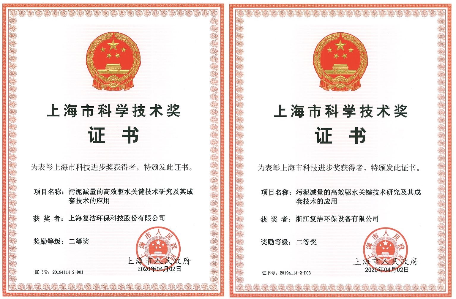 2020年5月19日,2019年度上海市科学技术奖励大会在上海展览中心举行,隆重表彰为上海科技事业和现代化建设作出突出贡献的科技工作者。市委书记李强出席会议并发表重要讲话,市委副书记、代市长龚正主持会议,市委常委、副市长吴清宣读2019年度上海市科学技术奖表彰决定。其中,由上海复洁环保科技股份有限公司牵头,联合同济大学、浙江复洁环保设备有限公司、上海城市污染控制工程研究中心有限公司共同完成的“污泥减量的高效驱水关键技术研究及其成套技术的应用”项目荣获2019年度上海市科技进步二等奖。