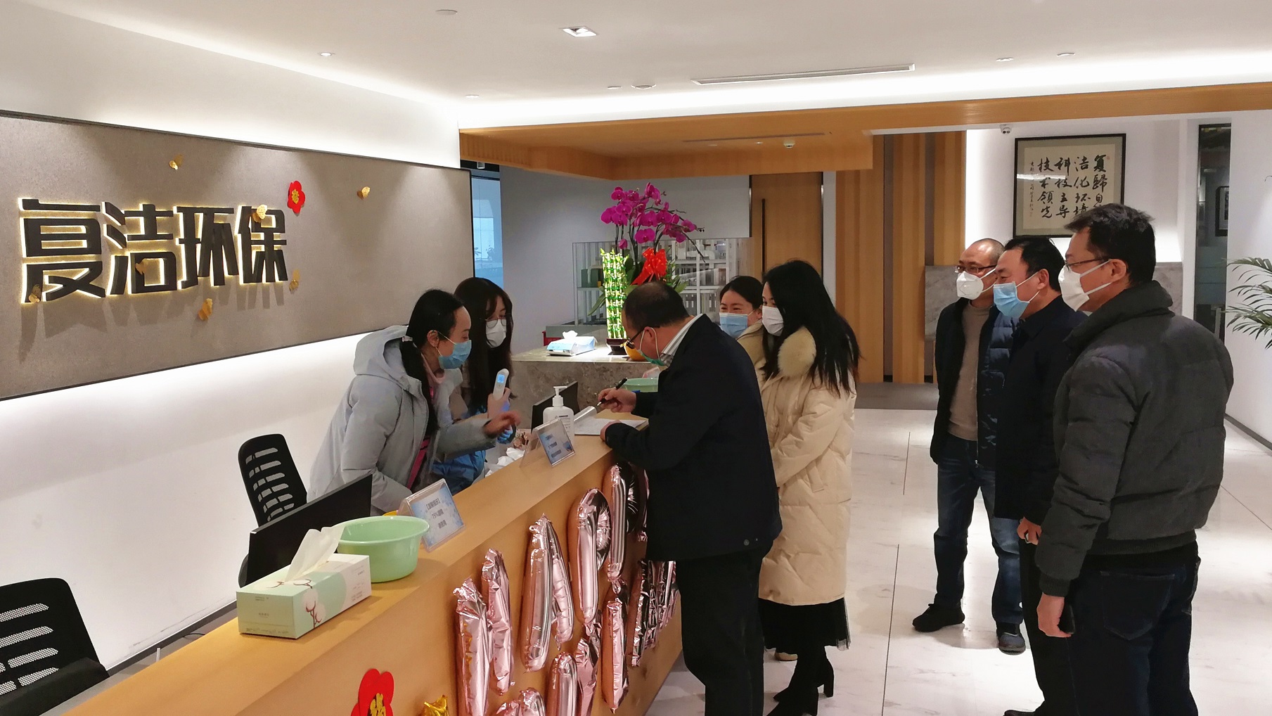 2020年2月20日下午,上海市杨浦区科委副主任陈柏霖、区科委企业科科长叶桂芳、企业科科员胡爱频等一行三人莅临复洁环保位于湾谷科技园的总部,实地调研新型冠状病毒疫情防控工作,了解企业复工情况,并进行现场指导。复洁环保董事长黄文俊、党支部书记吴岩等公司管理团队成员接待了区科委领导一行并汇报了公司防疫工作落实情况。
