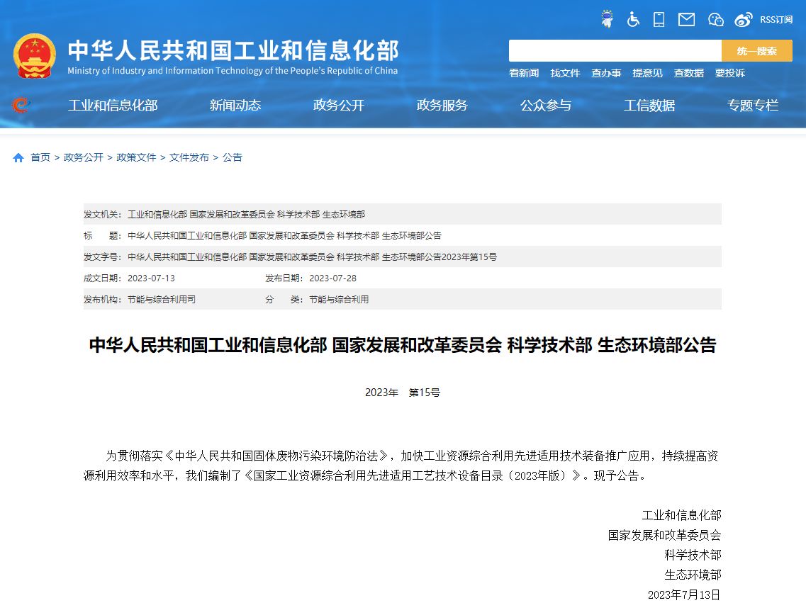 为贯彻落实《中华人民共和国固体废物污染环境防治法》,加快工业资源综合利用先进适用技术装备推广应用,持续提高资源利用效率和水平,工业和信息化部、国家发展和改革委员会、科学技术部、生态环境部共同编制了《国家工业资源综合利用先进适用工艺技术设备目录(2023年版)》,并于2023年7月28日正式对外发布。