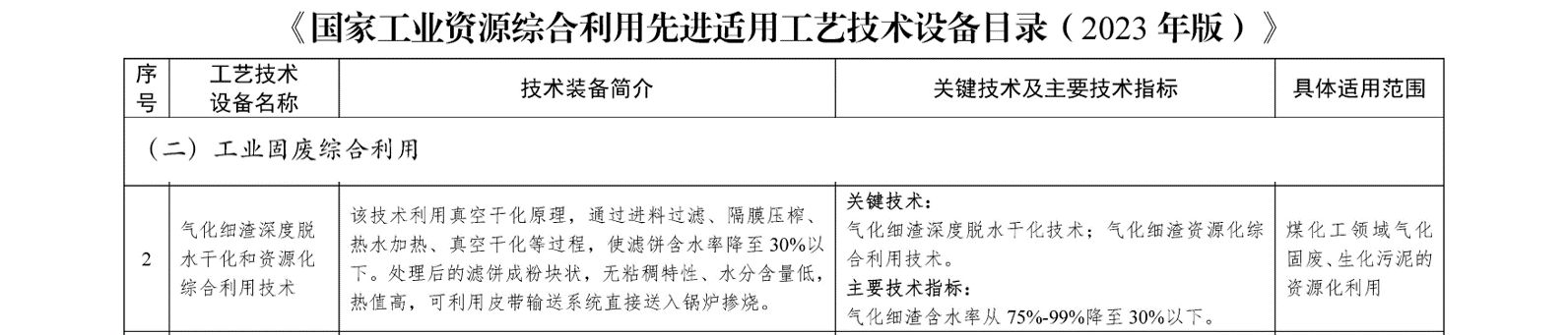 经地方推荐评审、公开征求意见等环节,由上海复洁环保科技股份有限公司与宁夏神耀科技有限责任公司联合开发的“气化细渣深度脱水干化和资源化综合利用技术”成功入选《国家工业资源综合利用先进适用工艺技术设备目录(2023年版)》。
