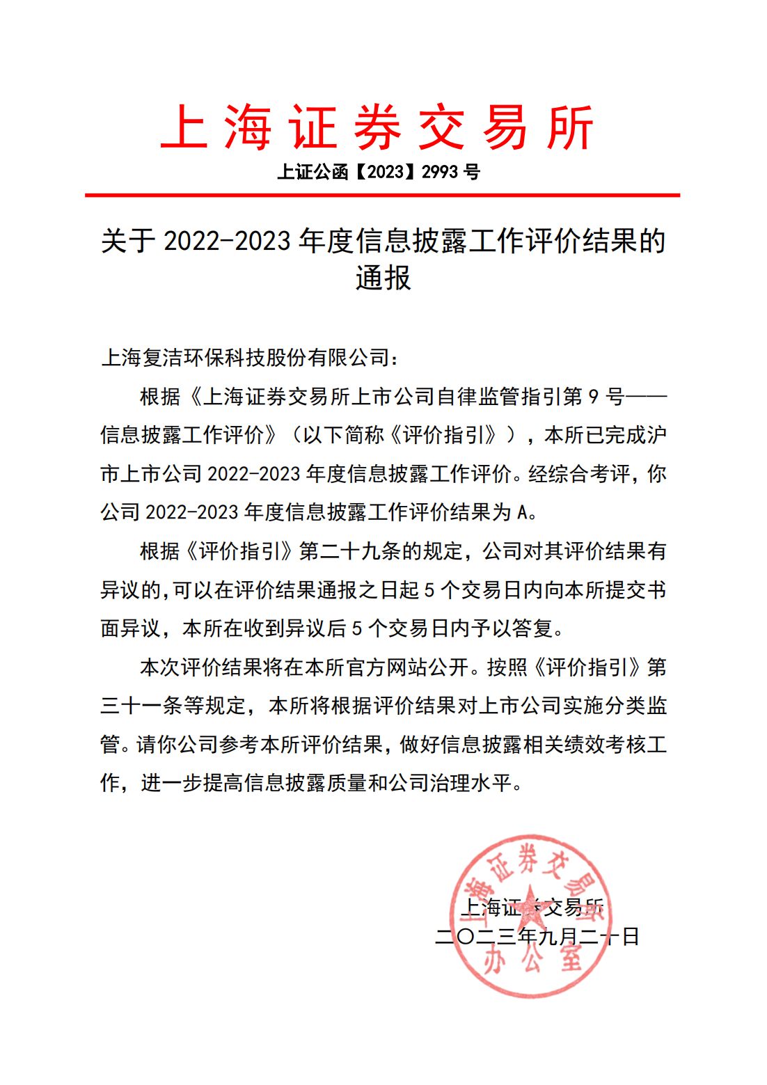 近日,上海复洁环保科技股份有限公司在上海证券交易所(以下简称“上交所”)2022-2023年度上市公司信息披露工作评价中获得最高评级“A”级,这是科创板上市公司首次纳入信息披露工作评价的考核范畴,彰显了上交所对公司在资本市场合规,尤其是信息披露、投资者关系、规范运作等工作的高度肯定。