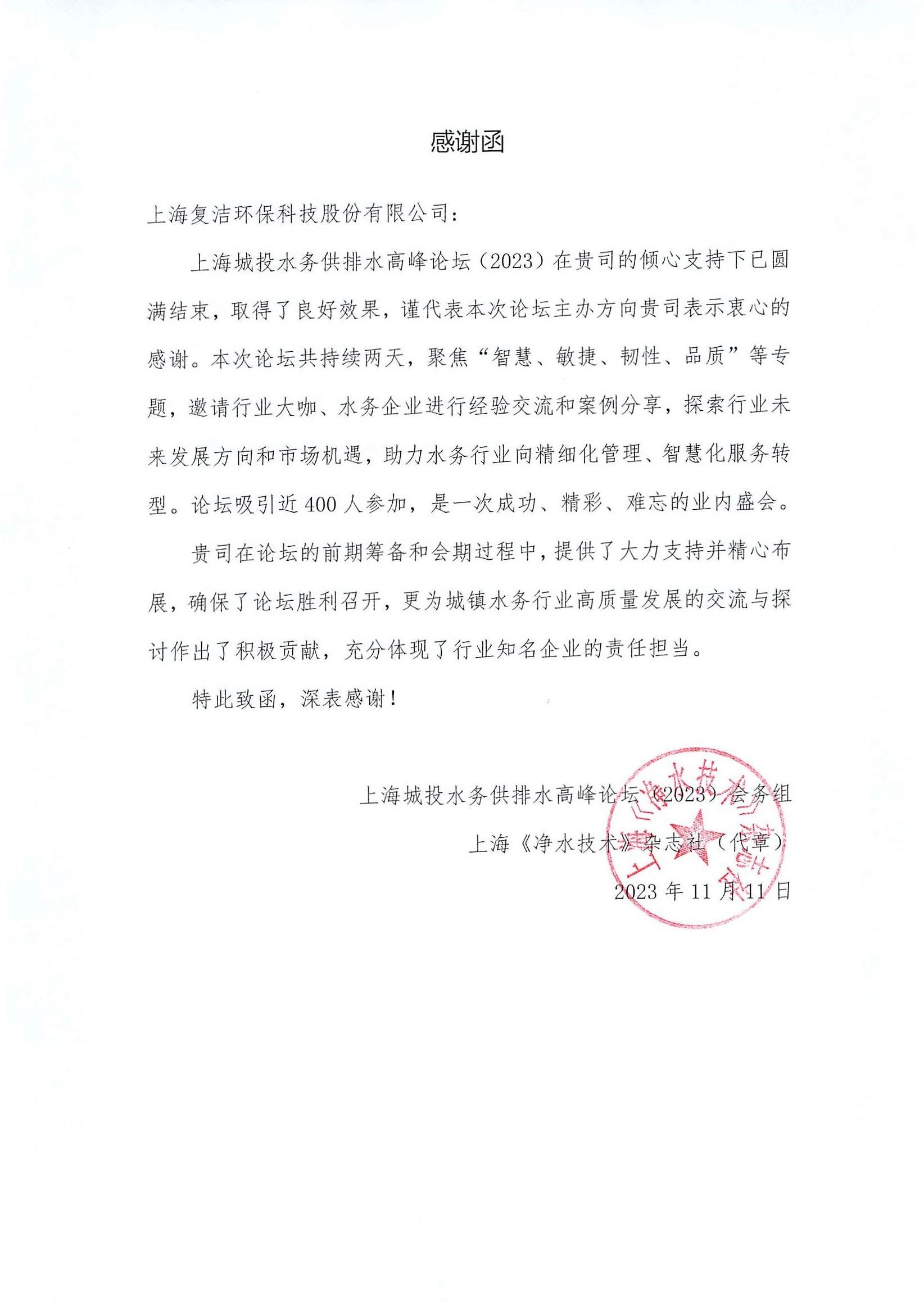 2023年11月10日-11日,上海城投水务供排水高峰论坛(2023)在沪隆重举行。本次论坛由上海城投水务(集团)有限公司主办,上海《净水技术》杂志社承办,IWA国际水协会和上海城市水资源开发利用国家工程中心有限公司协办,上海市供水行业协会、上海市排水行业协会、上海复洁环保科技股份有限公司等十余家单位作为支持单位参加。