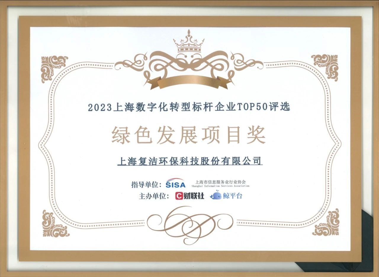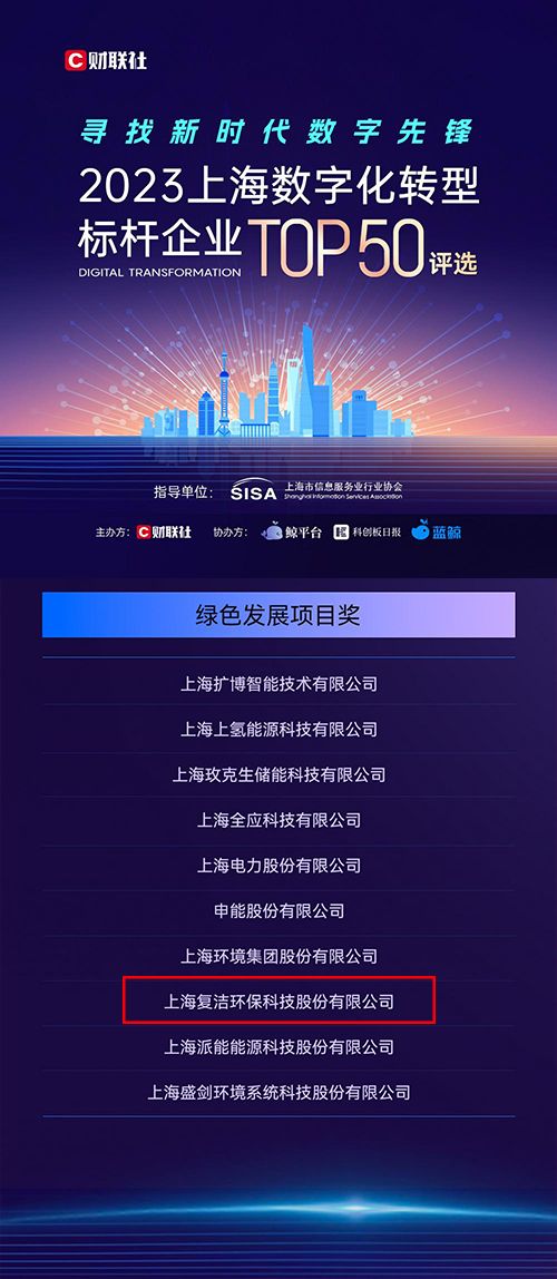 近日,由上海市信息服务业行业协会指导,财联社重点打造的“2023上海数字化转型标杆企业TOP50”榜单颁奖典礼在上海市黄浦区普华永道中心隆重召开。复洁环保作为绿色发展的践行者,凭借在环境保护、节能降碳、绿色创新等方面卓越表现荣获“绿色发展项目奖”!