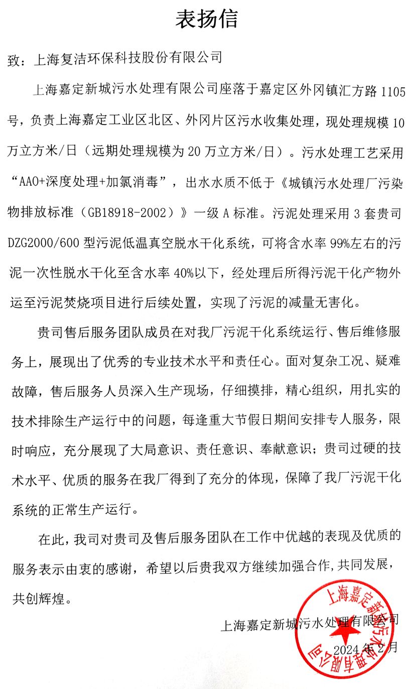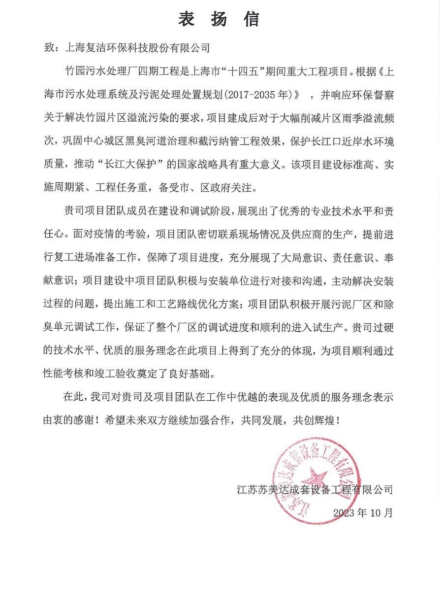 近期,复洁环保收到竹园污水处理厂四期工程、上海嘉定新城污水处理厂项目等业主来信,对公司技术设备和优质服务给予高度评价。作为一家以创新为根本,致力于成为全球节能低碳高端装备的领军企业,复洁环保始终坚持“服务于我们的客户,就是服务于大自然”的使命担当,凭借性能高效、质量稳定、服务到位的优势,技术产品和专业服务得到了业主等各方的高度评价。