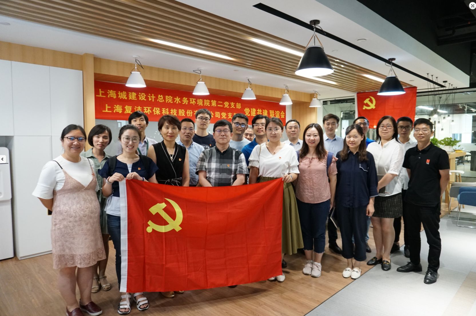 为庆祝中国共产党建党98周年,扎实做好“不忘初心、牢记使命”主题教育活动,近日上海复洁环保科技股份有限公司党支部与上海城建设计总院水务环境第二党支部开展了 “优势互补增动力、不忘初心促双赢”主题党日共建活动。城建设计总院水务环境党总支书记朱浩川、复洁环保党支部书记吴岩、董事长黄文俊及双方党支部成员参加了本次活动。
