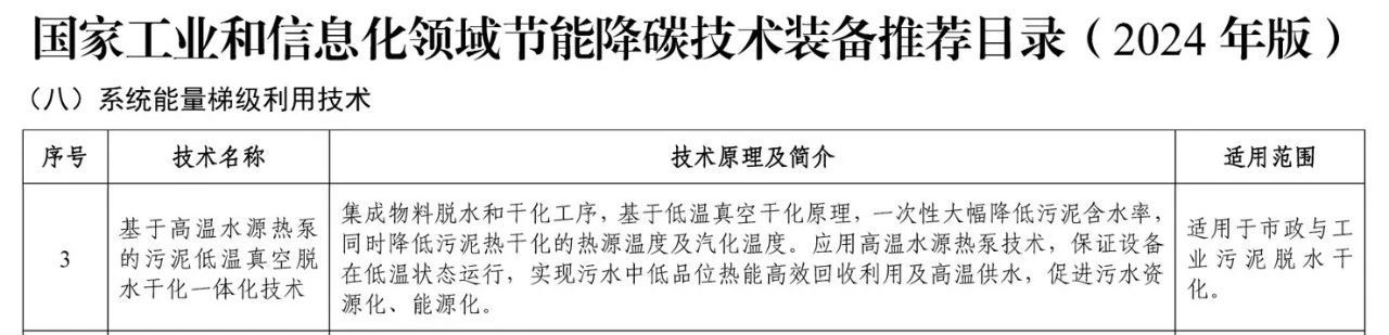 上海复洁环保科技股份有限公司自主开发并申报的“基于高温水源热泵的污泥低温真空脱水干化一体化技术”,作为系统能量梯级利用技术之一,成功入选《国家工业和信息化领域节能降碳技术装备推荐目录(2024年版)》。