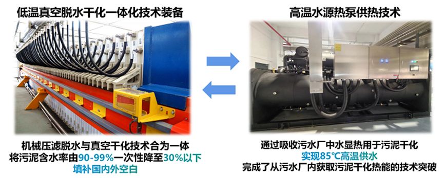 “基于高温水源热泵的污泥低温真空脱水干化一体化技术” 集成物料脱水和干化工序,基于低温真空干化原理,一次性大幅降低污泥含水率,同时降低污泥热干化的热源温度及汽化温度。应用高温水源热泵技术,保证设备在低温状态运行,实现污水中低品位热能高效回收利用及高温供水,促进污水资源化、能源化。