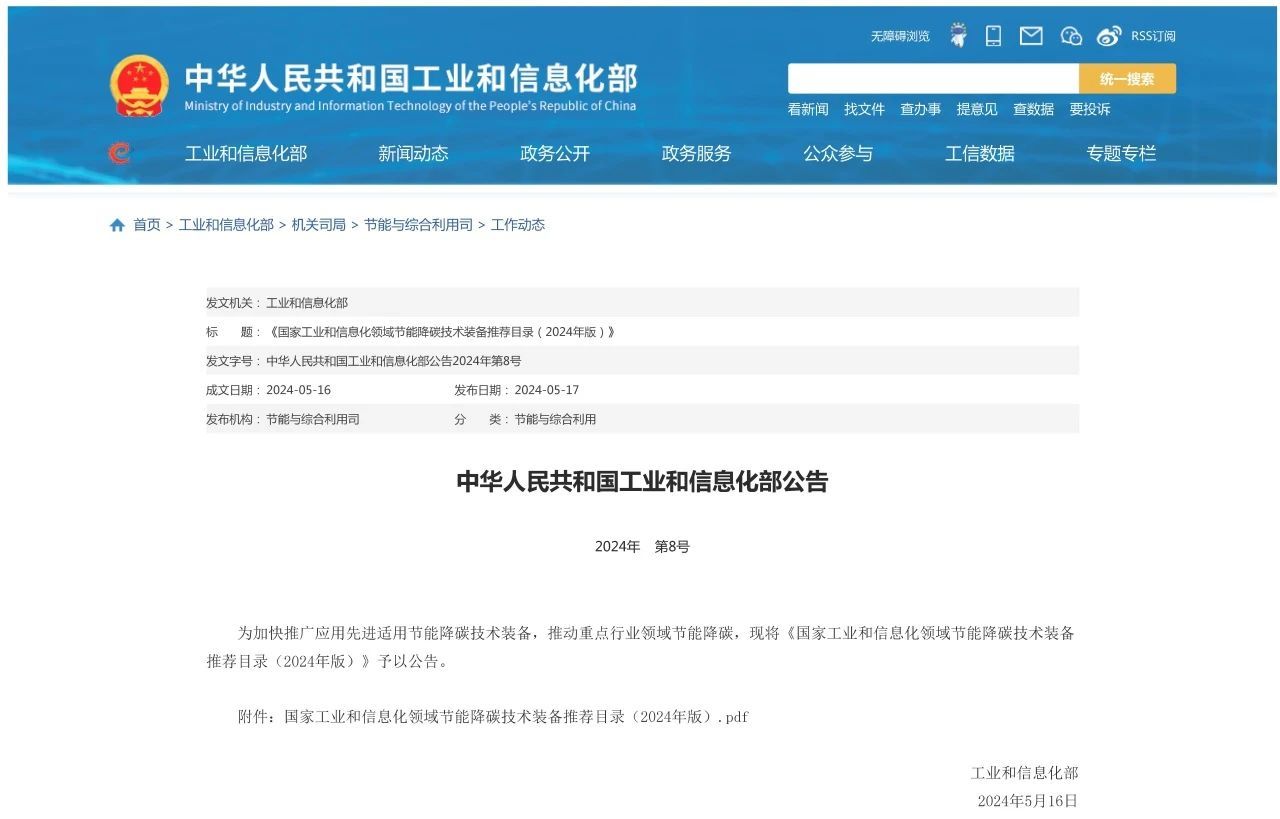 为加快推广应用先进适用节能降碳技术装备,推动重点行业领域节能降碳,经省级工业和信息化主管部门及通信管理局、有关中央企业、行业协会推荐,专家评审、公示等程序,工业和信息化部编制了《国家工业和信息化领域节能降碳技术装备推荐目录(2024年版)》,并于2024年5月17日正式予以公告。
