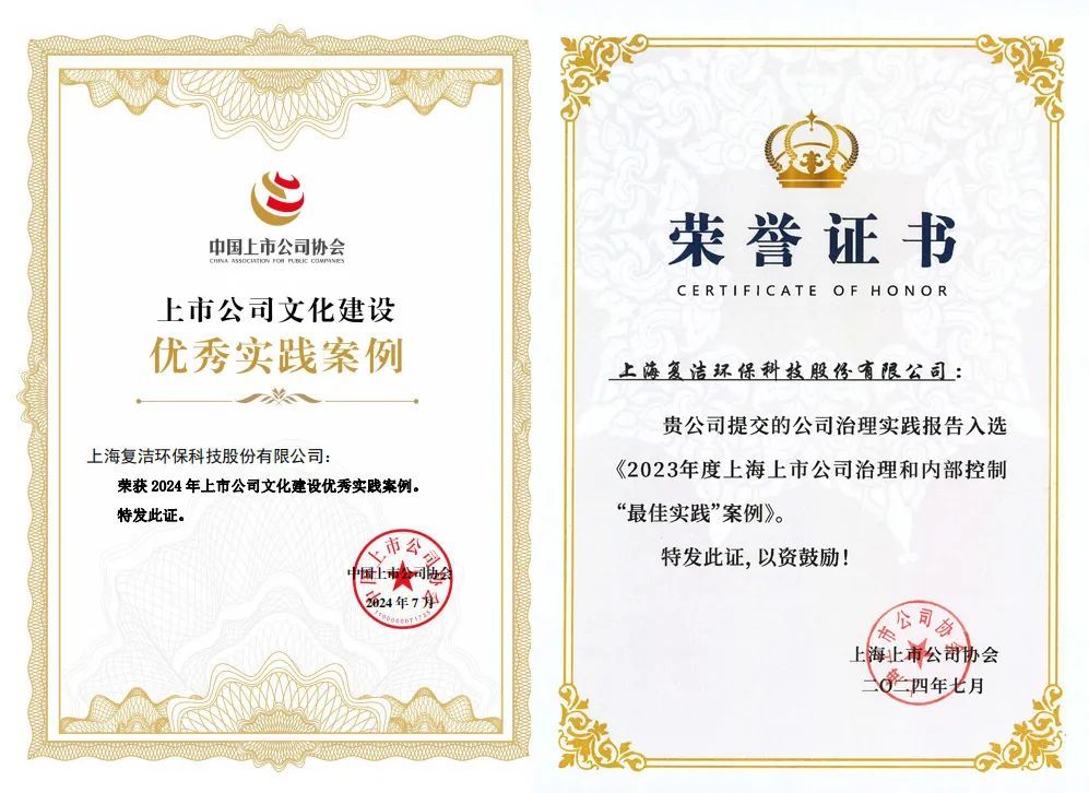 近日,中国上市公司协会发布“2024上市公司文化建设最佳实践案例征集活动”榜单,复洁环保凭借多年来在企业文化建设中的创新举措和卓越表现,荣获“2024年上市公司文化建设优秀实践案例”。同时,在上海上市公司协会举行的第四届第三次会员大会上,经过客观指标得分,专业评审委员会意见和监督部门审核,复洁环保荣幸地入选“2023年度上海上市公司治理和内部控制最佳实践案例”(共16家),这一殊荣是对复洁环保在公司治理以及高质量发展等方面工作和成绩的高度肯定,也进一步激励公司持续完善治理机制、提升治理效能。