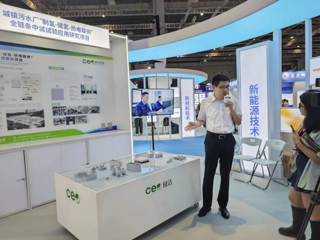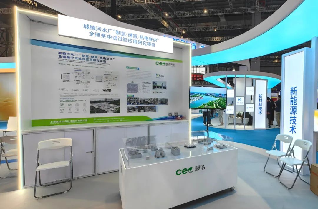 本次展会,复洁环保系统展示了公司低温真空脱水干化一体化技术装备、废气净化系列技术装备、高温水源热泵技术装备等核心技术装备,着重显示了公司自主研发、技术耦合和装备集成能力。浙江复洁耐高温干化滤板为代表的高端装备生产制造能力,捷碳科技综合性双碳解决方案等服务,得到了海内外专业人士的积极肯定。公司牵头实施的“城镇污水厂‘制氢-储氢-热电联供’全链条中试试验应用研究项目”,在全球范围内首次实现污水厂“绿氢制备-固态储氢-热电联供”的全链条应用与循环经济示范,受到了与会人士的空前关注。