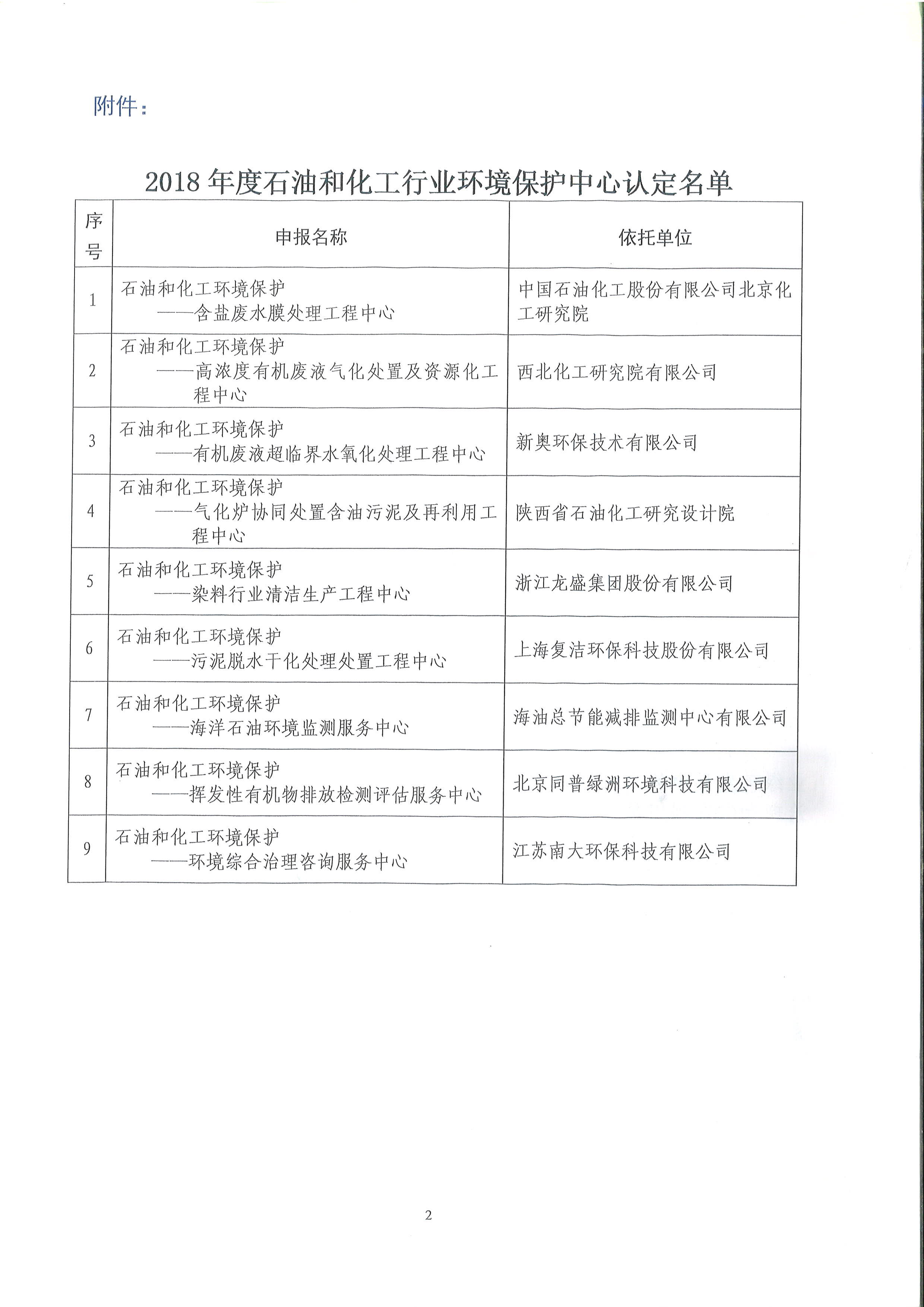 附件:2018年度石油和化工行业环境保护中心认定名单
