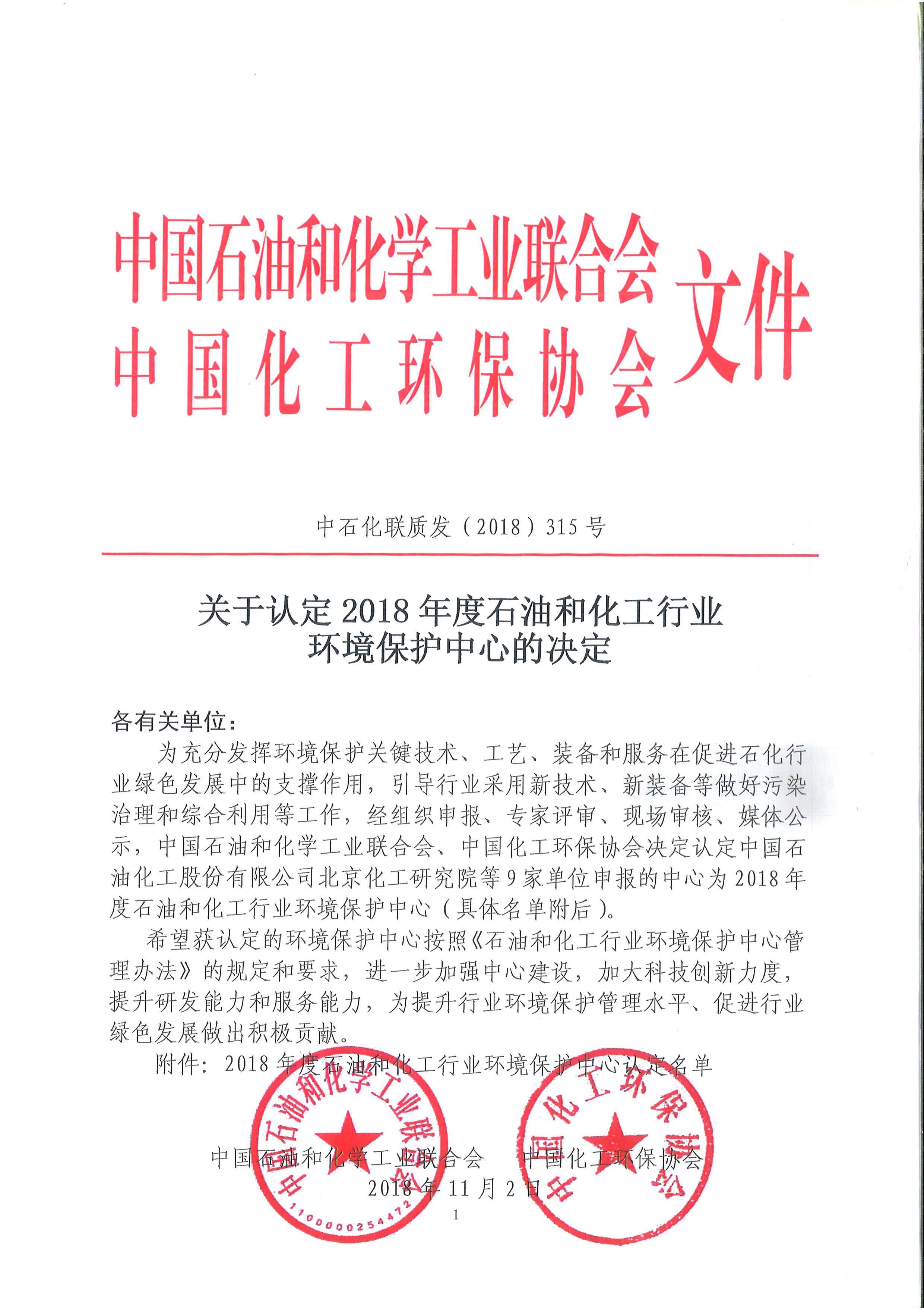为充分发挥环境保护关键技术、工艺、装备和服务在促进石化行业绿色发展中的支撑作用,引导行业采用新技术、新装备等做好污染治理和综合利用等工作,经组织申报、专家评审、现场审核、媒体公示,中国石油和化学工业联合会、中国化工环保协会决定认定中国石油化工股份有限公司北京化工研究院等9家单位申报的中心为2018年度石油和化工行业环境保护中心(具体名单附后)。