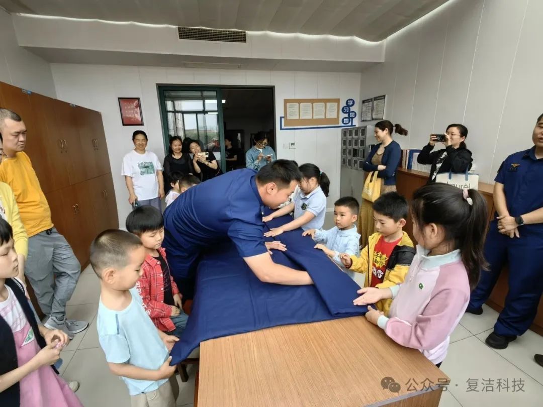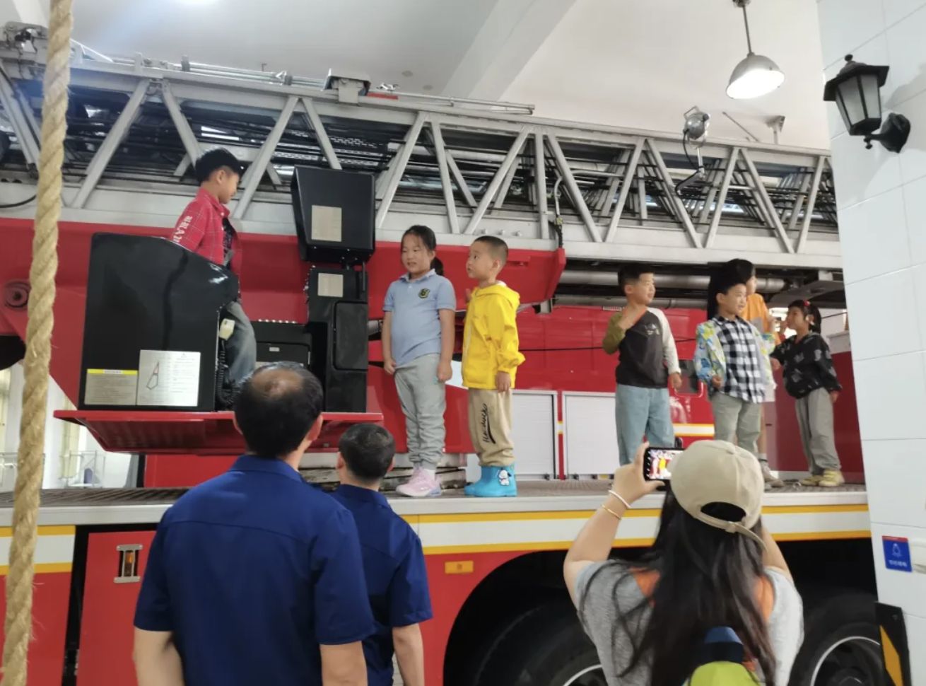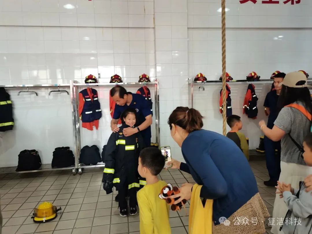 接着,小朋友们在消防员的帮助下,试穿了消防衣、试背了灭火器。厚厚的消防衣穿在身上,小朋友们瞬间变成了“小小消防员”。虽然衣服有些沉重,但小朋友们的脸上都洋溢着兴奋和自豪。